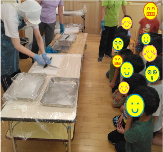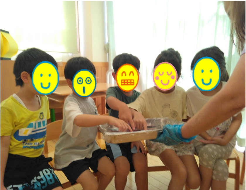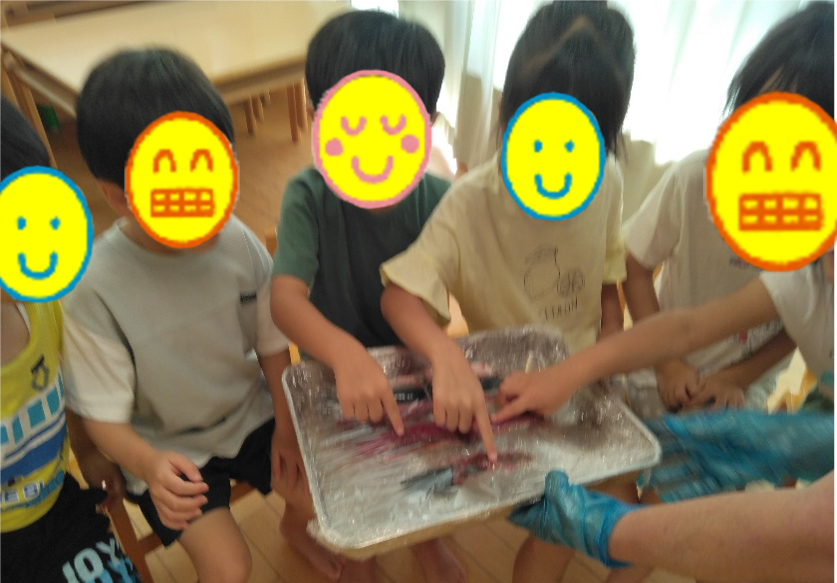 普段は切り身になった状態の魚を見ることが多い子どもたちですが、今日は丸ごとの『さんま』を用意しラップの上から触れたり、捌くところをみたりしました。