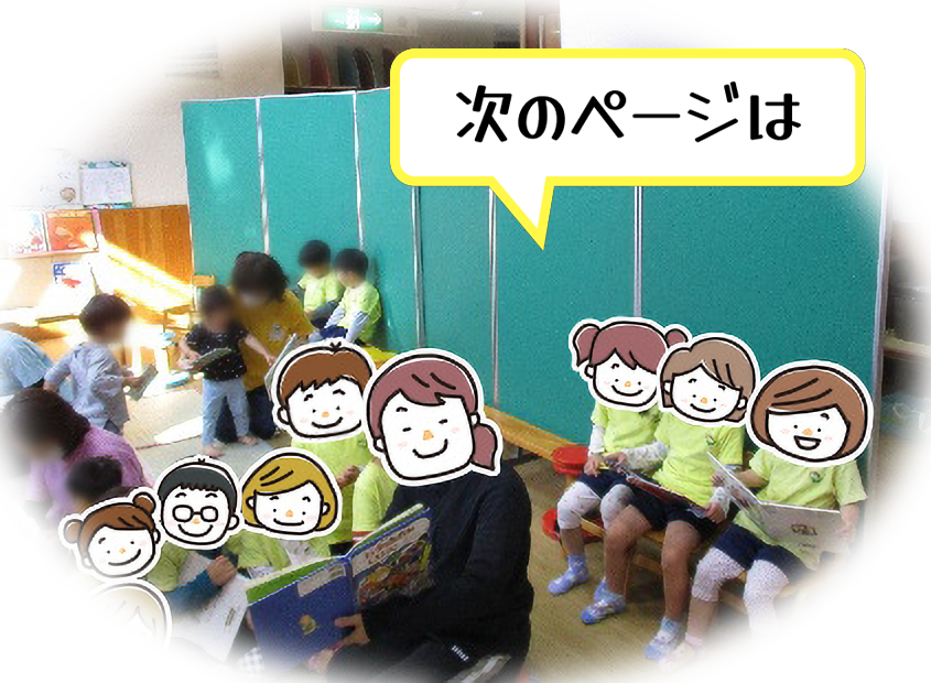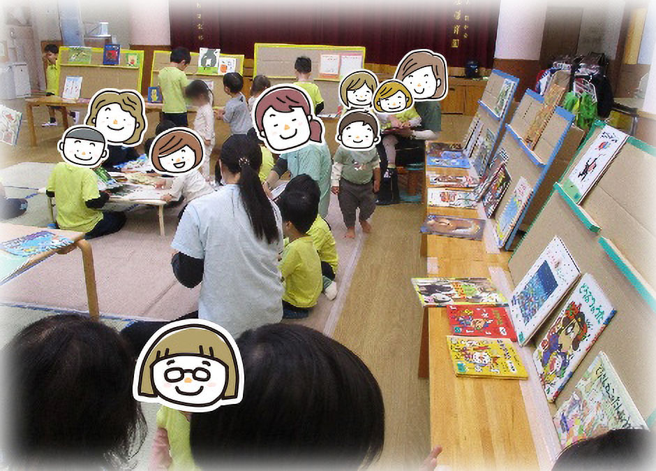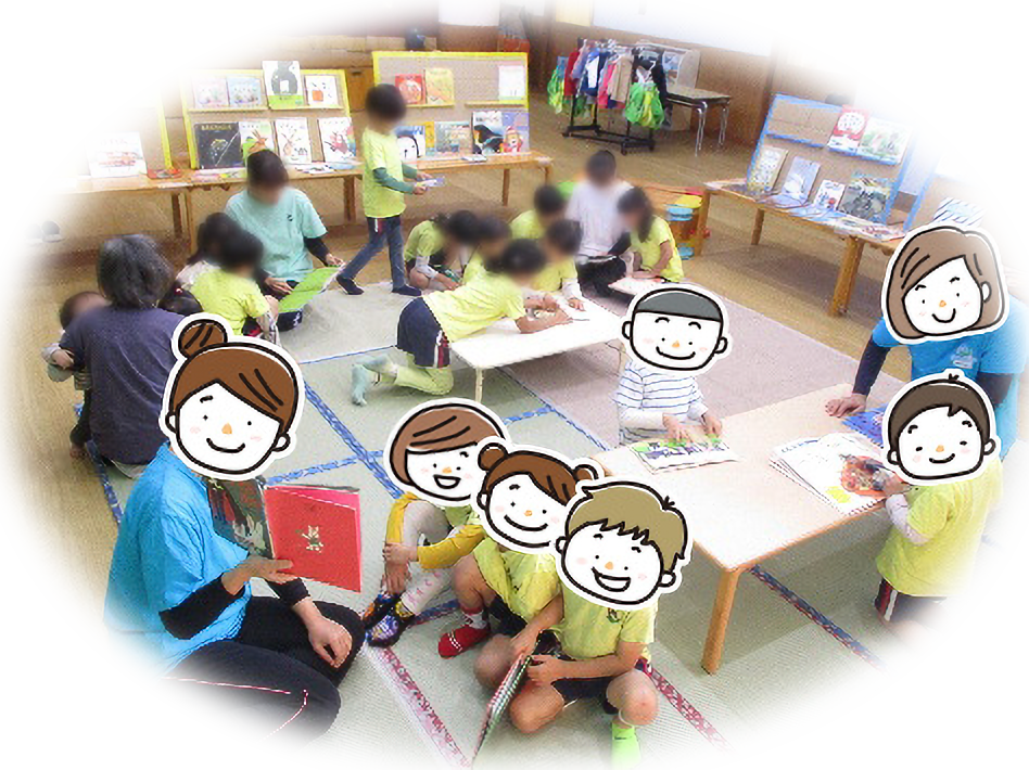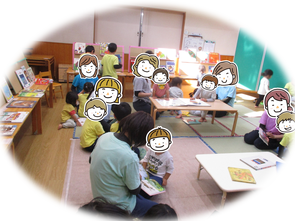 毎月1〜2回図書館で借りてきた絵本約100冊を子どもたちが手に取れるように配置をして絵本に親しんでいます。
