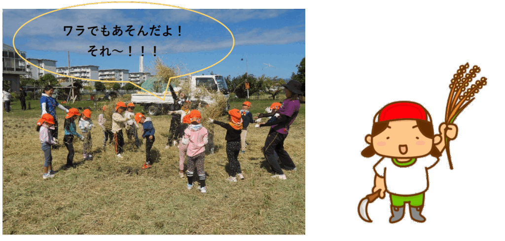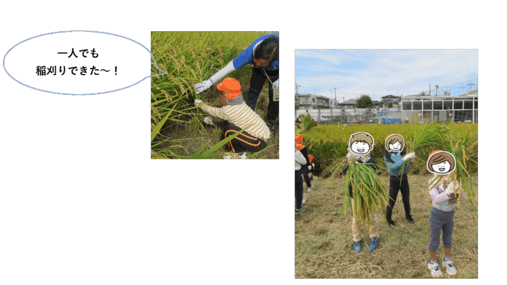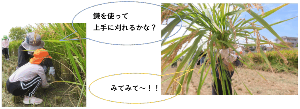 おとのは学園の田んぼに6月に植えた苗が、立派に稲穂になったので稲刈り体験をさせていただきました。貴重な経験に、子どもたちもワクワク。
