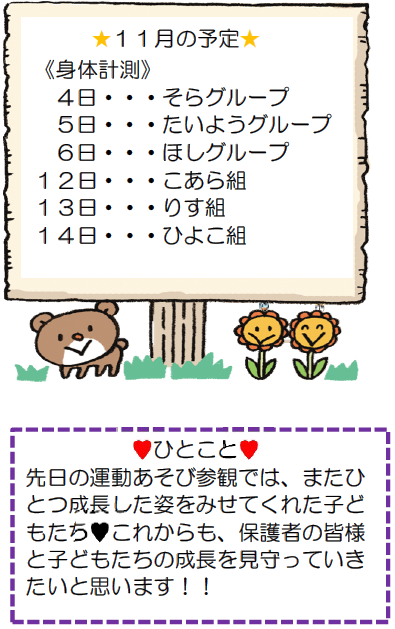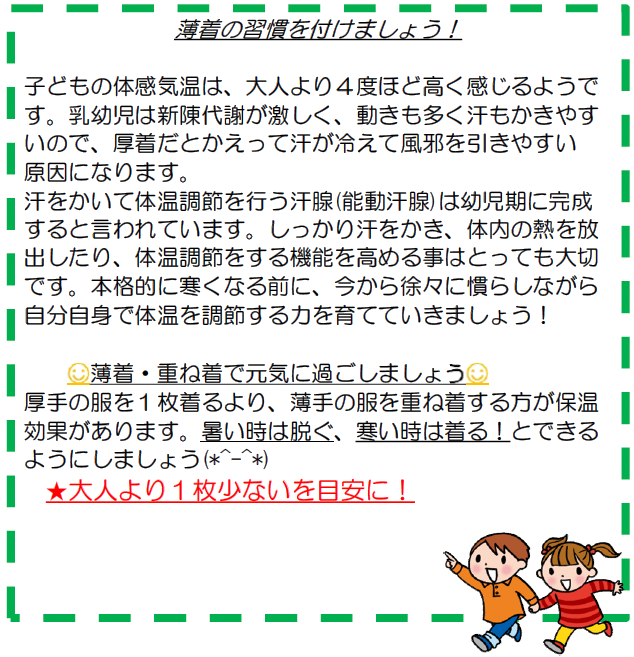 秋から冬へとバトンタッチをする季節がやってきました。朝晩は肌寒く、気温が下がり、温度も下がると冬の感染症が流行しやすくなります。しっかり食べて十分に睡眠を取り、体力をつけて免疫力アップすることで病気に感染しにくい体になります。うがい・手洗いもしっかり行い、これからの季節を元気に過ごしましょう(*^-^*)