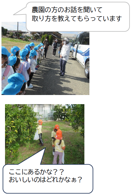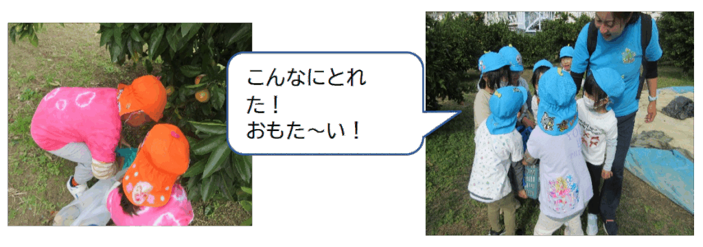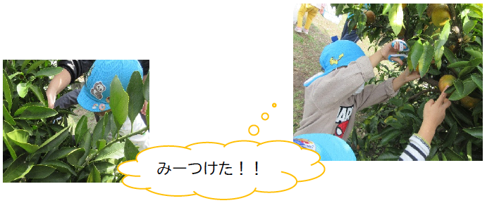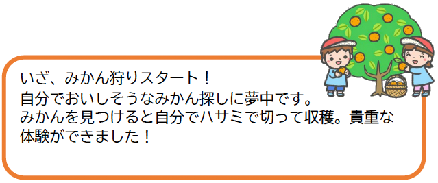 いい天気で、絶好のお出かけ日和。マイクロバスに乗って4歳・5歳別々に農園まで行き、それぞれみかん狩りを楽しみました。