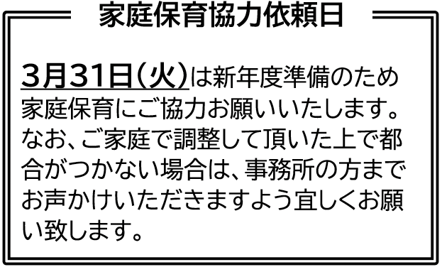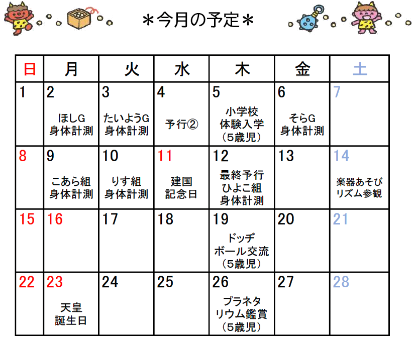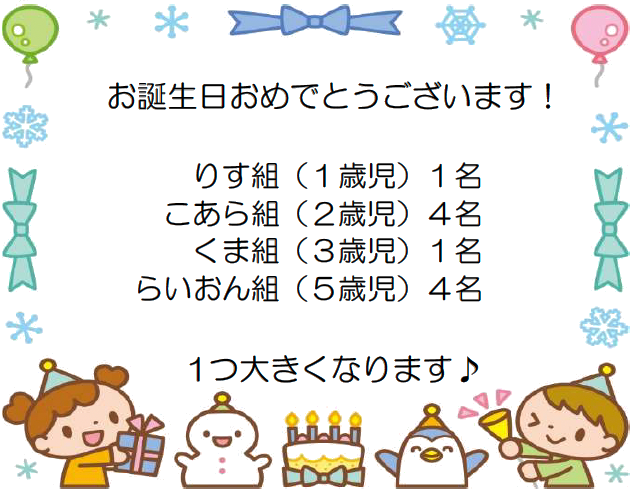 一年で最も寒さの厳しい季節となりました。朝、園庭に出る時に「寒いからいややなぁ〜」という声も聞こえてきますが「氷がはっているよ!」と伝えると、寒さよりも好奇心の方が勝り、大急ぎで園庭に飛び出してくる子ども達です。ワクワクする毎日を送る事で寒さに負けず、元気に遊んで心も体も強い玉島っ子に育みたいと思います‼3月にはその成長した姿をクラス、グループ懇談でお話させて頂きますので、お忙しい時期ではありますがお越しいただきますよう宜しくお願いいたします。