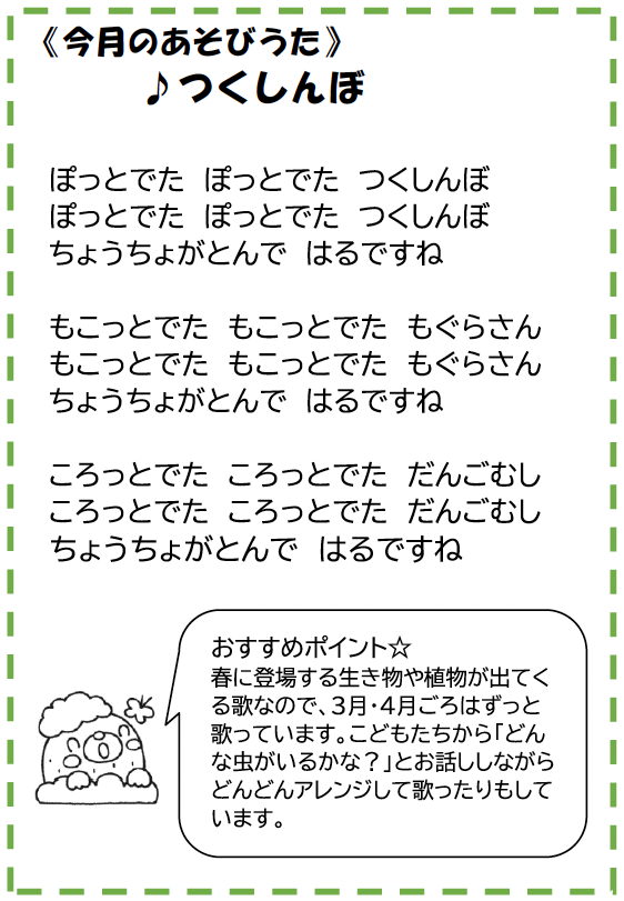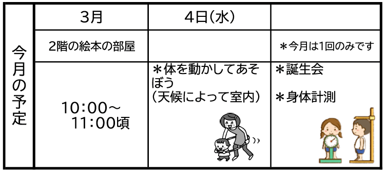 すこしずつ春に向けて草花が芽を出しはじめ、暖かくなるのが待ち遠しくなります。子ども達も外に出て日差しの中を寒さに負けず楽しそうに走り回っています。今月が終われば、新しい生活が始まる方もおられるかと思います。子どもとゆっくり遊べる時間を大切にできるよう地域開放にも、ぜひお越しください。