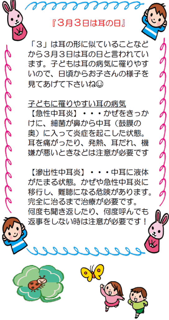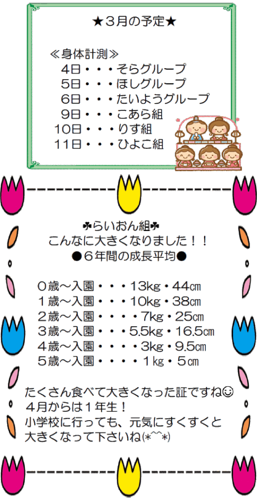 晴れた日に感じる日差しに春を感じられるようになってきました。子どもたちはこの1年で心も身体も大きく成長し、たくましくなりました。季節の変わり目は自律神経が乱れやすく大人も子どもも、体調を崩しがちになります。元気に新年度が迎えられるよう、病気やけがに気をつけて、残りの1ヶ月を楽しく過ごしていきましょう(*^▽^*)
