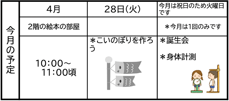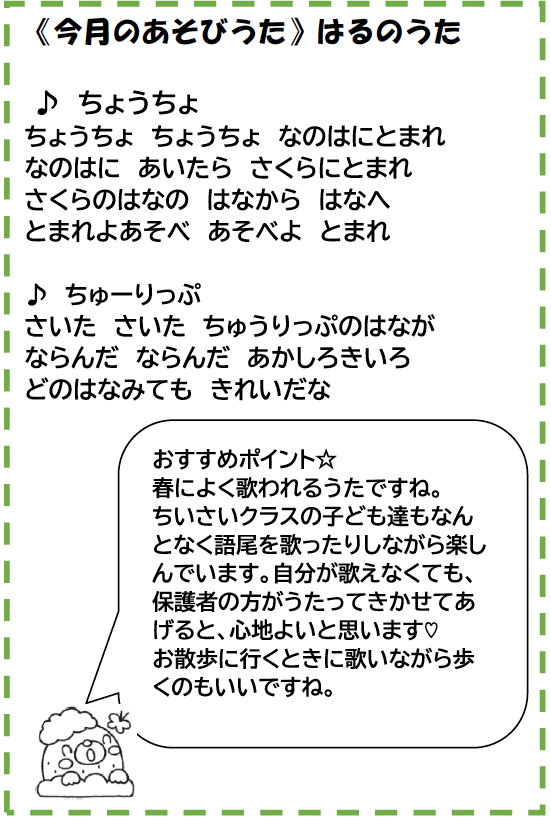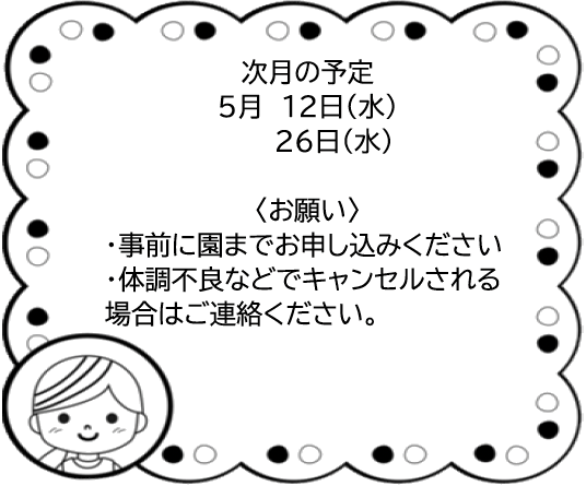 春の心地よい風に吹かれ、外に出やすい季節になってきました。新しい生活が始まる方もおられるかと思いますが、子どもと一緒にゆっくり過ごす時間のひとつに地域開放にもぜひお越しください。子育ての悩みや、お家での困りごとの相談などもお聞かせください。お家の人にとっても居心地のいい場になればと思います。
